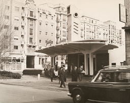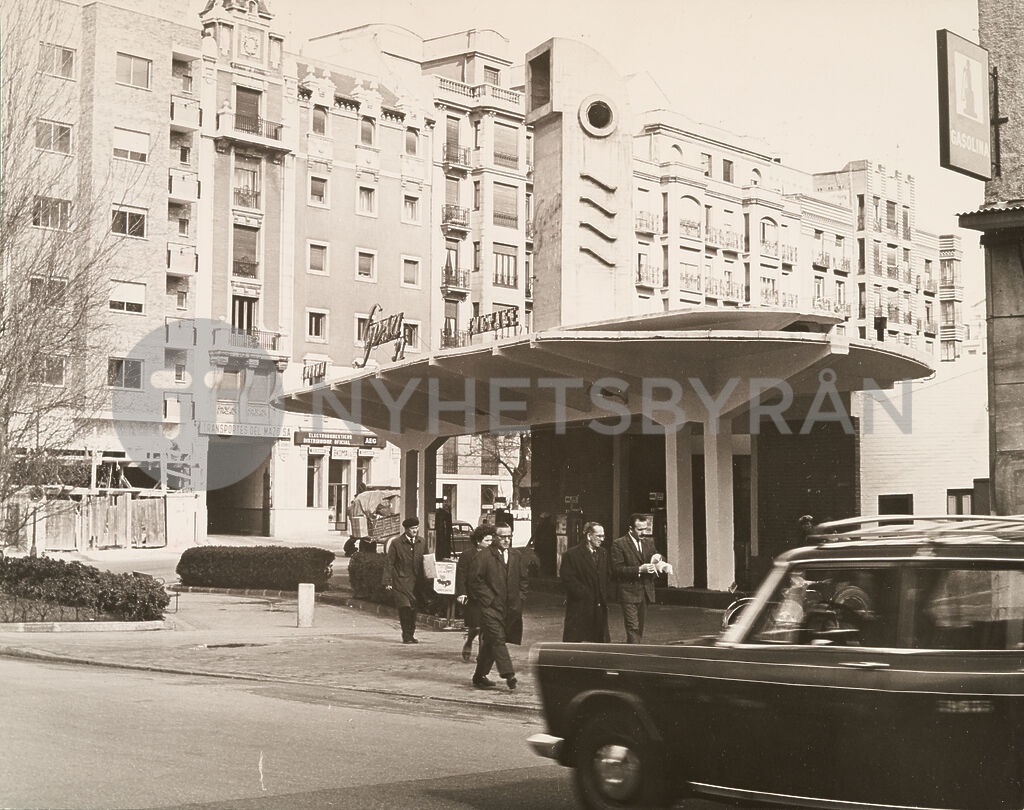 1970. Madrid, 1970s. A traditional Madrid taxi, black and with a red stripe, passes in front of an urban gas station.