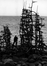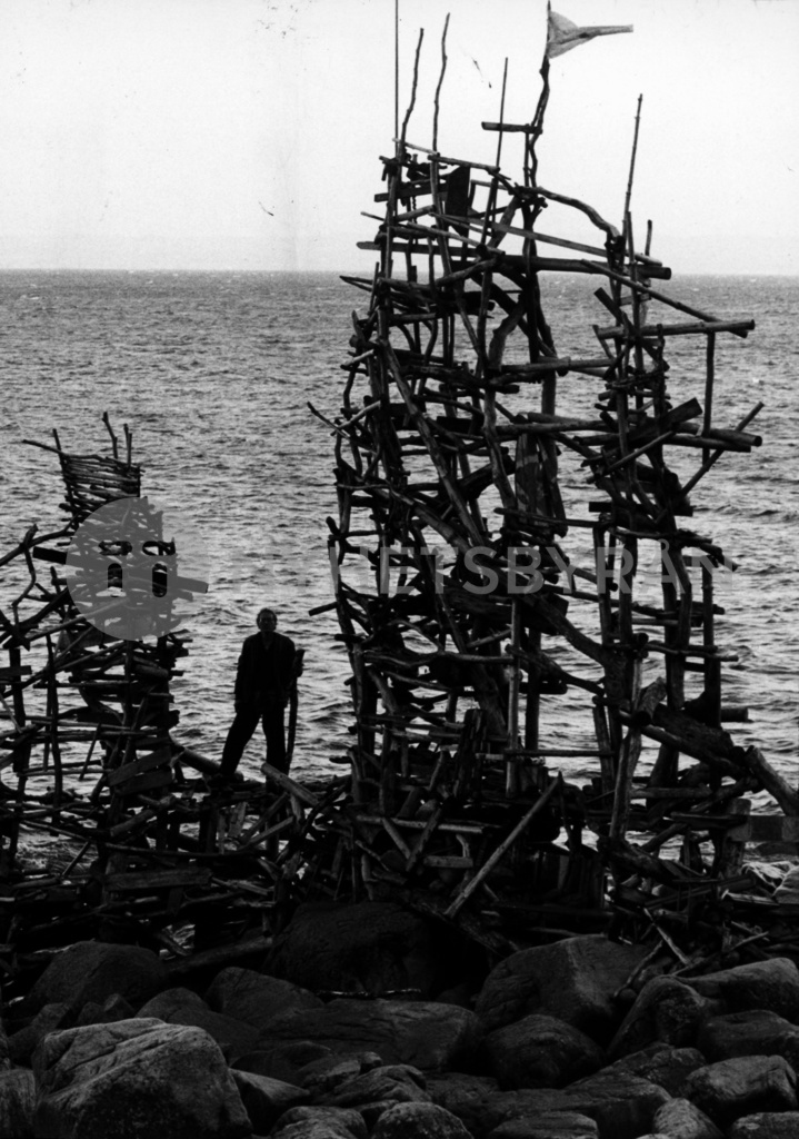KULLABERG OKÄNT FOTODATUM. Lars Vilks och hans skulptur på stranden i Naturreservatet i Kullaberg i Skåne. Foto: Torbjörn Andersson Code: 4 COPYRIGHT SCANPIX SWEDEN