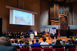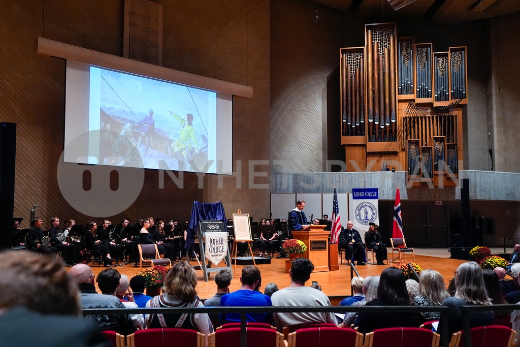 Decorah, USA 20251006. Kronprins Haakon holder tale under besøket på Luther College i Deocorah. Luther College ble grunnlagt i 1861 av norske immigranter i Decorah og har siden vært et senter for høyere utdanning og norsk kulturarv i USA. Kronprinsen besøker Decorah i forbindelse med besøket hans til USA. Foto: Lise Åserud / NTB