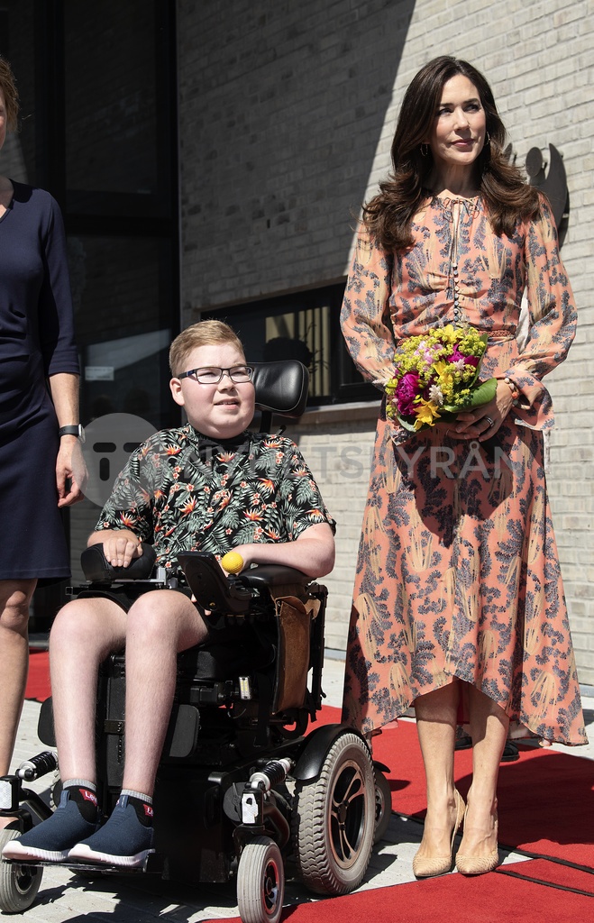 Kronprinsesse Mary bliver modtaget af blomsterdreng Noa Lindgaard Lijegren. Kronprinsesse Mary indvier børne- og ungehospice Strandbakkehuset i Rønde, onsdag den 16. juni 2021. Strandbakkehuset er Danmarks første nybyggede børne- og ungehospice og består af fire familielejligheder, der er målrettet børn og unge med livsbegrænsende og livstruende sygdom. Strandbakkehuset tilbyder ophold for hele familien og er baseret på holdningen om, at alle børn og unge, uanset hvor kort deres liv måtte være, skal have de bedste muligheder for at få så meget ud af deres liv, som det er muligt - udviklingsmæssigt og socialt.. (Foto: Bo Amstrup/Ritzau Scanpix)Foto Bo Amstrup / Ritzau Scanpix / TT / kod 93000 ref: ***BETALBILD***