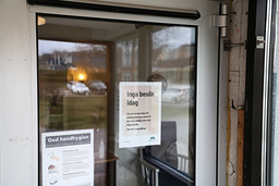 MOTALA 20200402 Regeringen har beslutat om besöksförbud på samtliga landets äldreboenden för att förhindra spridningen av sjukdomen covid-19. Beslutet trädde i kraft den 1 april. Här ses en skylt om besöksstopp på ett äldreboende i Motala. Foto Jeppe Gustafsson / TT / Kod 71935