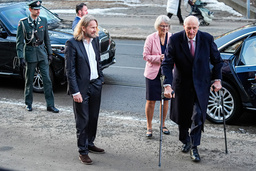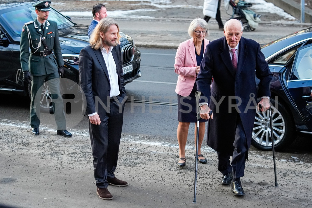 Oslo 20250211. Kong Harald blir tatt imot av leder av Norske Idrettsleder-Veteraner (NIV), Tove Strand, og direkør for Nasjonalbiblioteket, Aslak Sira Myhre, utenfor Nasjonalbiblioteket før årsmøtet til Norske Idrettsleder-Veteraner på Nasjonalbiblioteket i Oslo. Foto: Terje Bendiksby / NTB