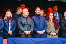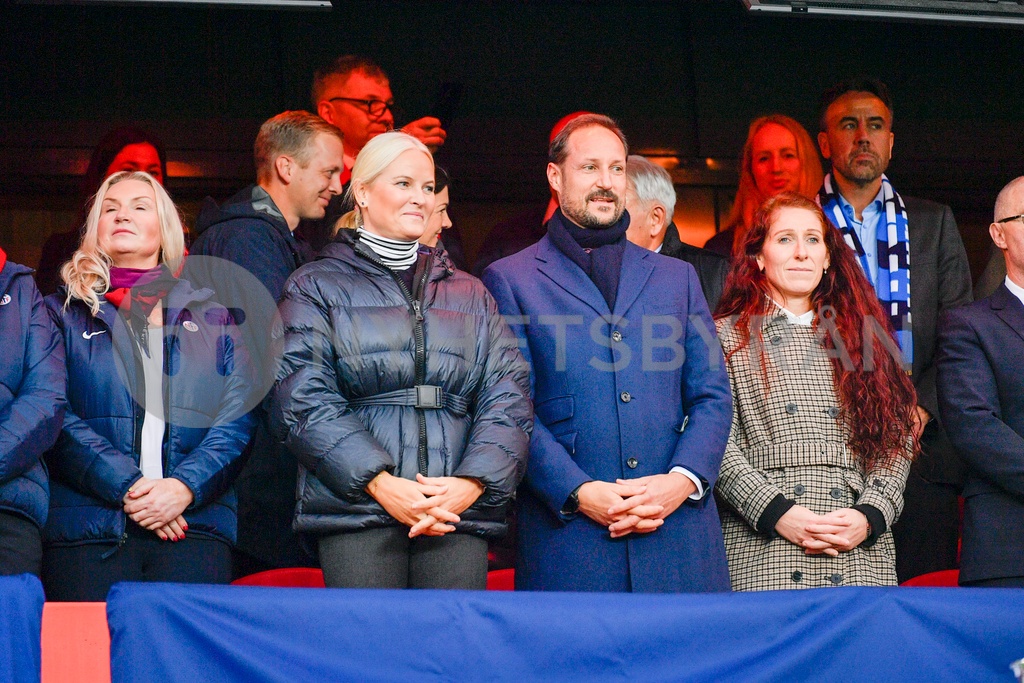 Oslo 20221105. Kronprins Haakon, Kronprinsese Mette-Marit og fotballpresident Lise Klaveness under cupfinalen i fotball mellom Brann og Stabæk på Ullevaal stadion i Oslo. Foto: Rodrigo Freitas / NTB