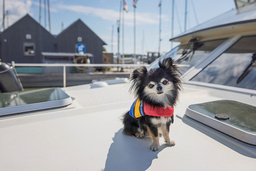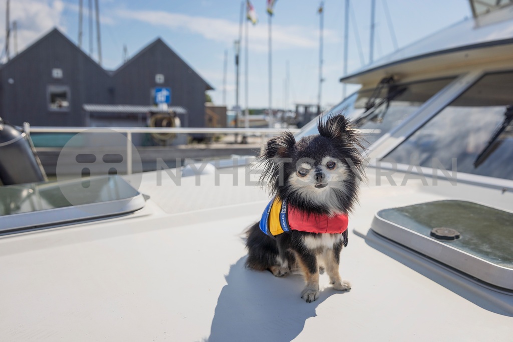 TROSA, SVERIGE 20250723 Hund med flytväst som åker båt i gästhamnen i Trosa. Foto: Caisa Rasmussen / TT / Kod 12150