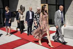 Kronprinsesse Mary bliver modtaget af Jørgen Reinicke (bestyrelsesformand for Strandbakkehuset og Hospice Djursland), Dorit Simonsen (hospiceleder for Strandbakkehuset og Hospice Djursland), Anders Kühnau (formand for regionsrådet, Region Midtjylland) og Lena Andersen (formand, Støtteforeningen Strandbakkehuset og Hospice Djursland). Kronprinsesse Mary indvier børne- og ungehospice Strandbakkehuset i Rønde, onsdag den 16. juni 2021. Strandbakkehuset er Danmarks første nybyggede børne- og ungehospice og består af fire familielejligheder, der er målrettet børn og unge med livsbegrænsende og livstruende sygdom. Strandbakkehuset tilbyder ophold for hele familien og er baseret på holdningen om, at alle børn og unge, uanset hvor kort deres liv måtte være, skal have de bedste muligheder for at få så meget ud af deres liv, som det er muligt - udviklingsmæssigt og socialt.. (Foto: Bo Amstrup/Ritzau Scanpix)Foto Bo Amstrup / Ritzau Scanpix / TT / kod 93000 ref: ***BETALBILD***