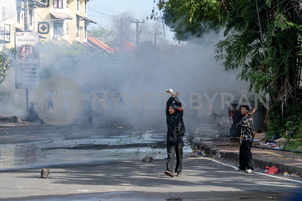 A medic from the protesters’ side gestures with a hand sign to avoid being shot by police during a protest. Massive protests erupted in several major cities across Indonesia following the death of Affan Kurniawan, an online motorbike taxi driver, who was fatally struck by a police armored vehicle in Jakarta, on August 28, 2025. Kurniawan’s death occurred amid escalating demonstrations over economic hardship, and dissatisfaction with government policies and legislative performance. (Photo by Dicky Bisinglasi / SOPA Images/Sipa USA)