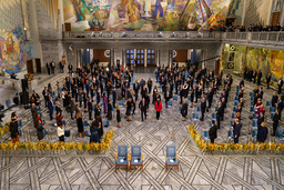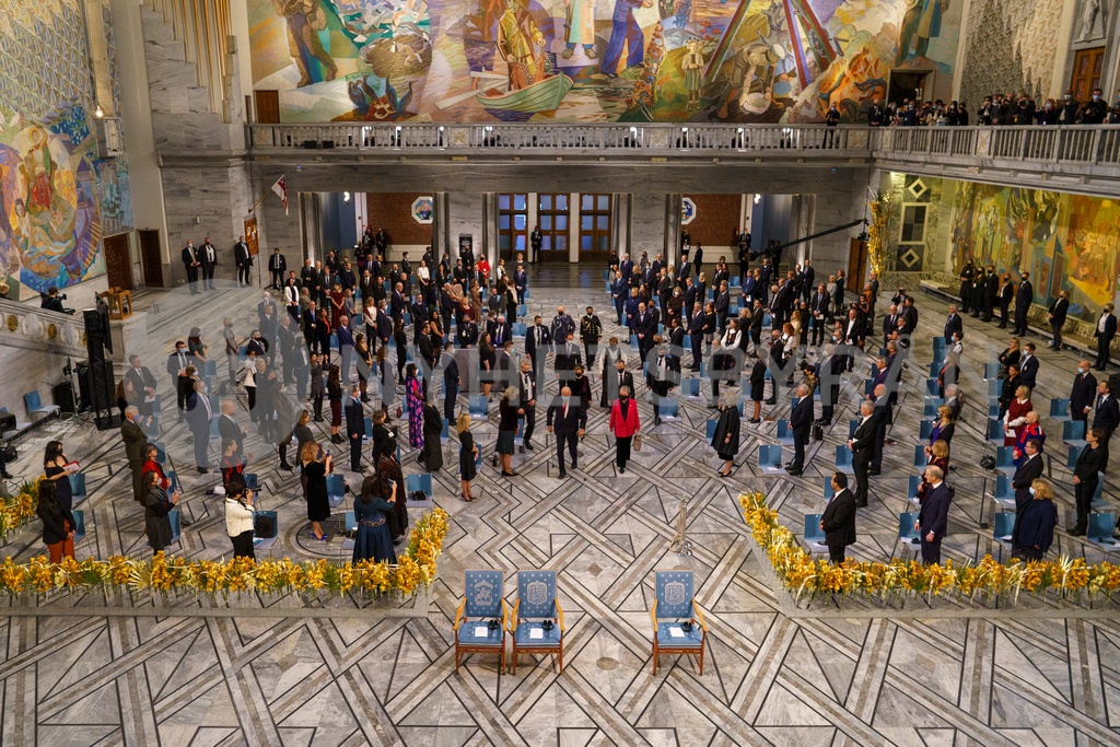 Oslo 20211210. Kong Harald, Dronning Sonja og kronprins Haakon ankommer utdelingen av Nobels fredspris i Oslo rådhus. Journalistene Maria Ressa og Dmitrij Muratov mottar Nobels fredspris 2021. Maria Ressa fra Filippinene og Dmitrij Muratov fra Russland tildeles Nobels fredspris for deres innsats for ytringsfrihet. Foto: Cornelius Poppe / NTB