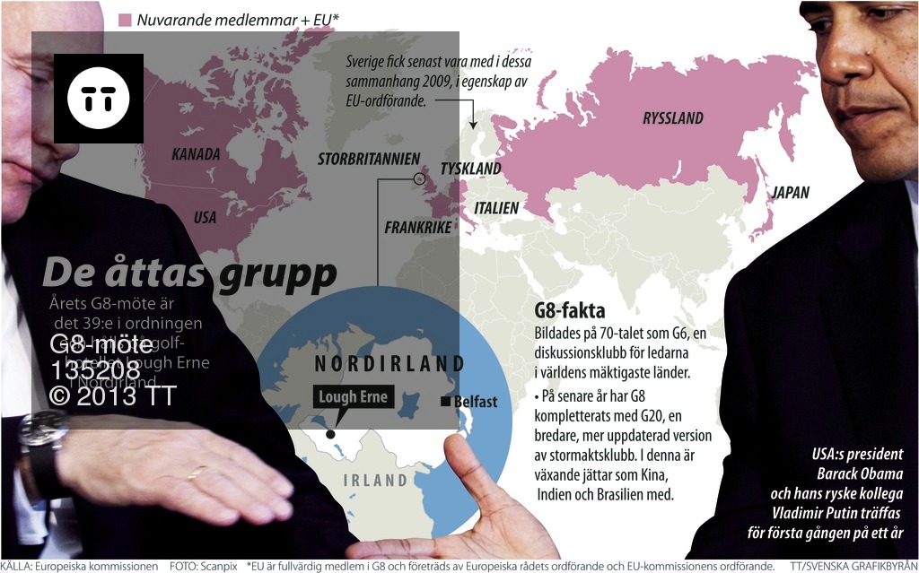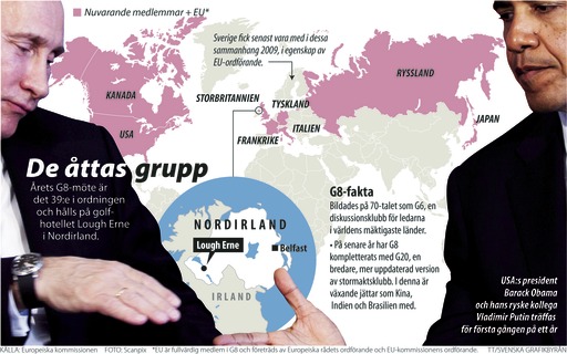 De mäktiga G8-länderna samlas till toppmöte vid Lough Erne i Nordirland. Deltar gör bland andra USA:s president Barack Obama och Rysslands president Vladimir Putin. Kartgrafik. OBS! Endast för Scanpix bildabonnenter!