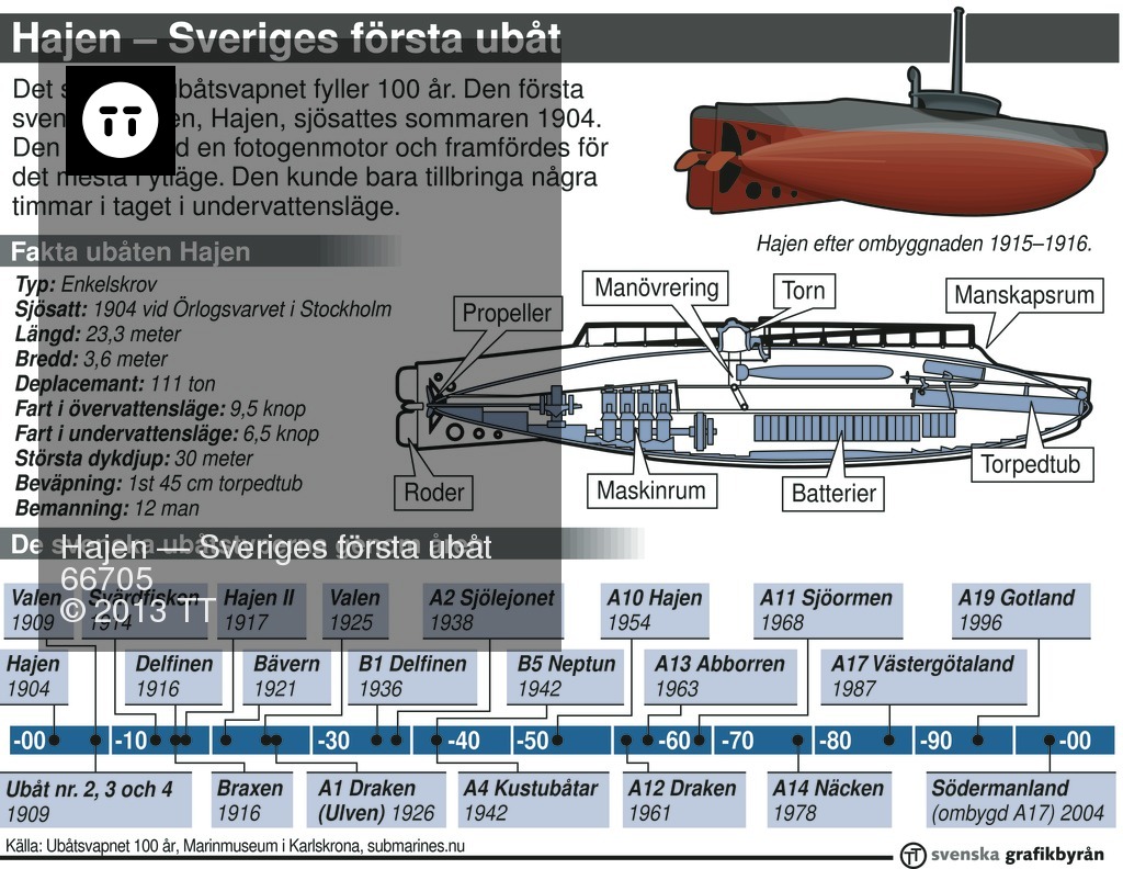 Det svenska ubåtsvapnet fyller 100 år. Den första svenska ubåten, Hajen, sjösattes sommaren 1904. Den drevs med en fotogenmotor och framfördes för det mesta i ytläge. Den kunde bara tillbringa några timmar i taget i undervattensläge.