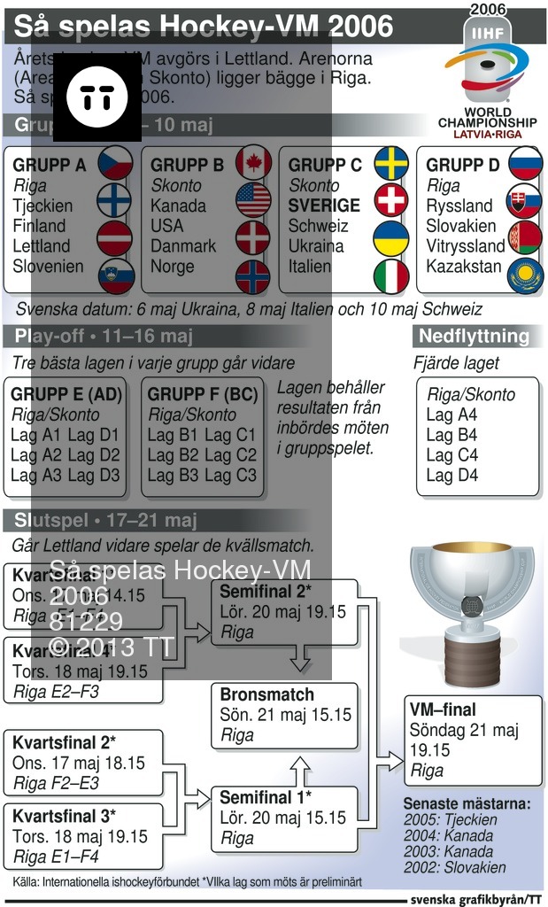 Årets hockey-VM avgörs i Lettland. Arenorna (Arean Riga och Skonto) ligger bägge i Riga. Så spelas VM 2006.