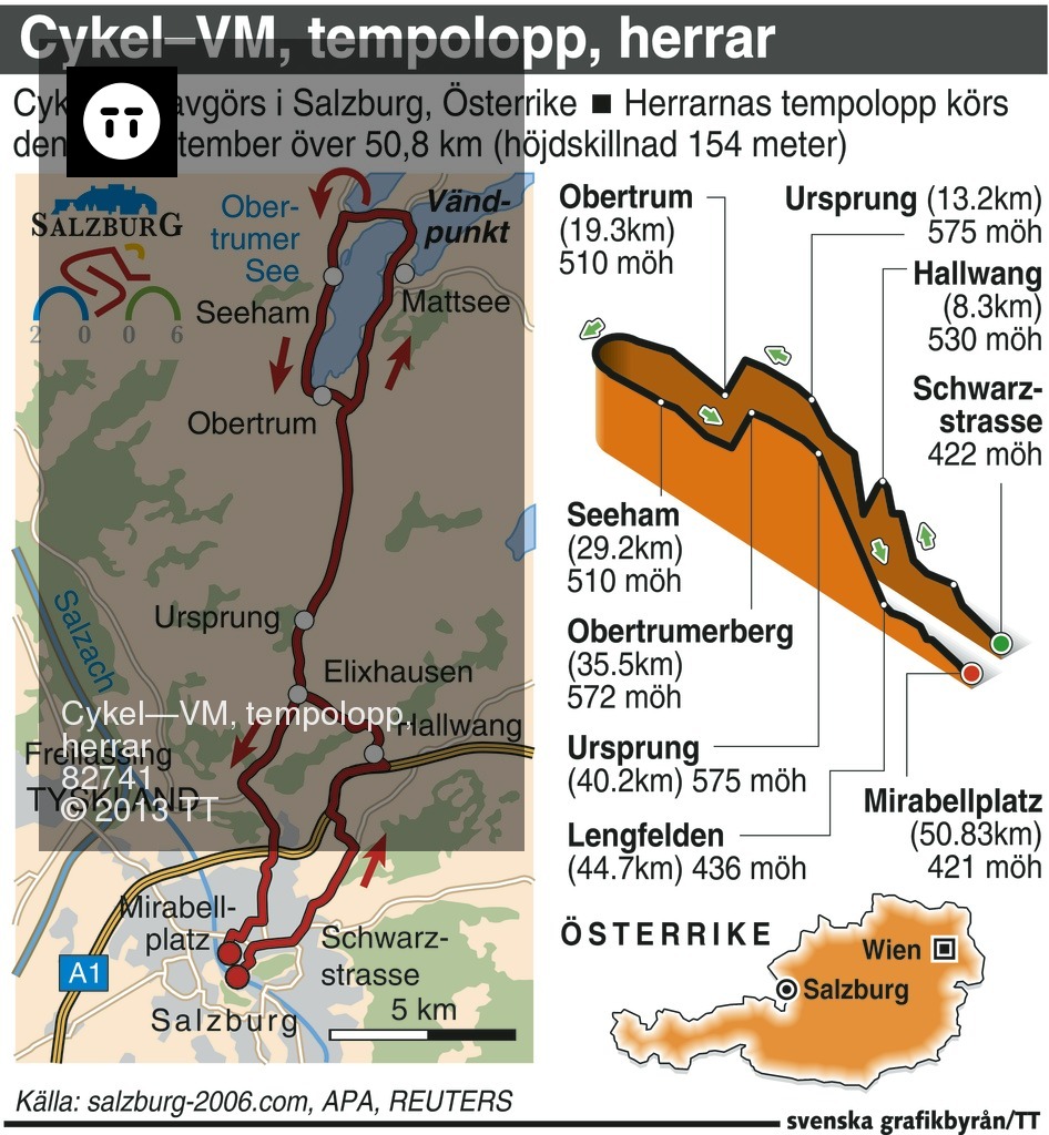 Cykel-VM avgörs i Salzburg, Österrike, Herrarnas tempolopp körs den 21 september över 50,8 km (höjdskillnad 154 meter)