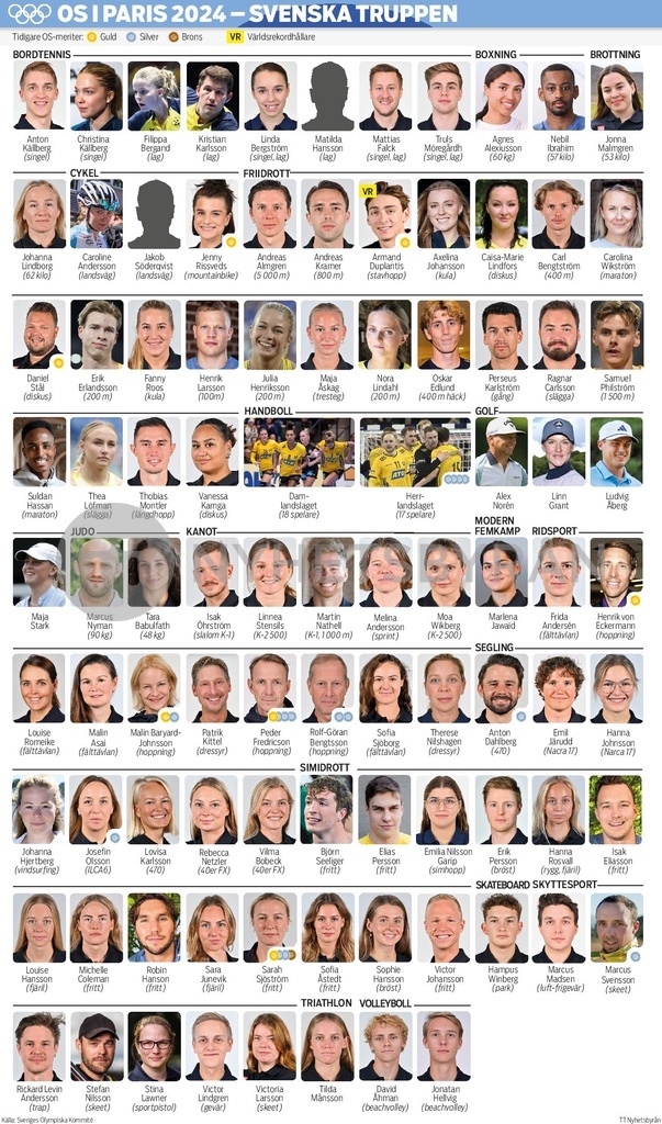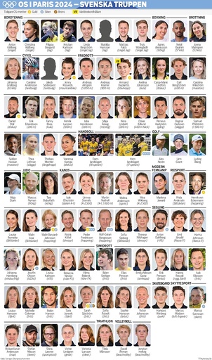 Alla aktiva i svenska OS-truppen 2024 i Paris. Samtliga sportgrenar med svensk representation. Grafiken visar också de som har tidigare OS-meriter och världsrekordsinnehavare. PRINT Storlek: 206 mm x 350 mm (5 sp)