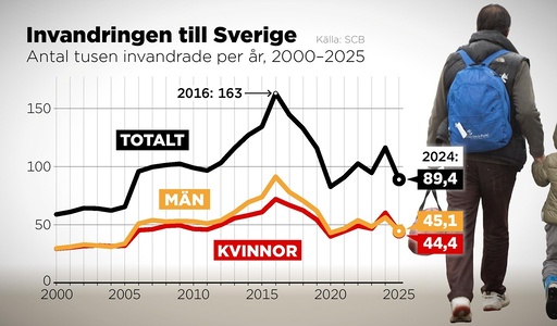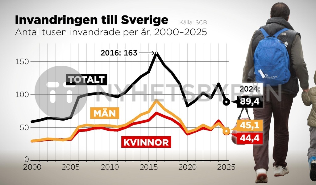 Antal tusen invandrade till Sverige per år, 2000–2025.