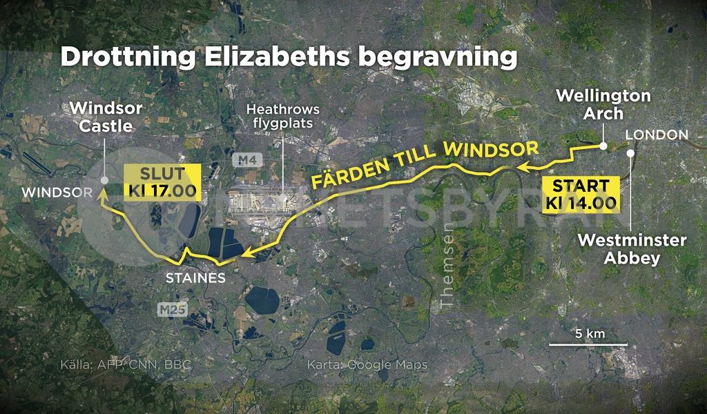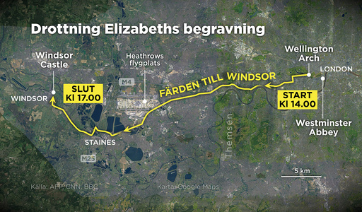 Efter att kistan lastas på bil förs den till St George's Chapel i Windsor Castle där begravningsceremonin tar vid.