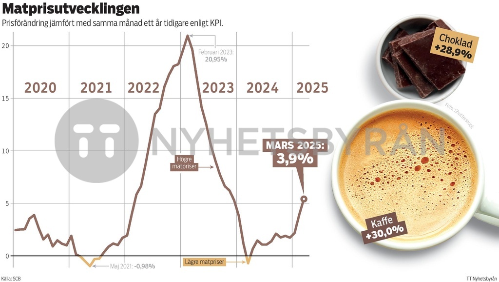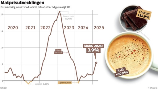 Prisförändring för livsmedel och alkoholfria drycker jämfört med samma månad ett år tidigare.