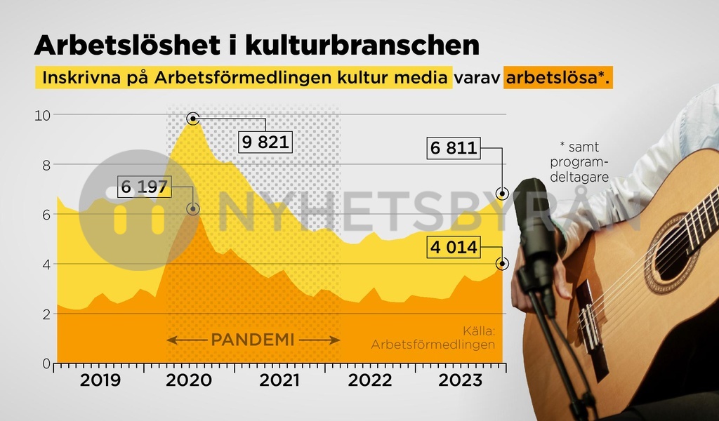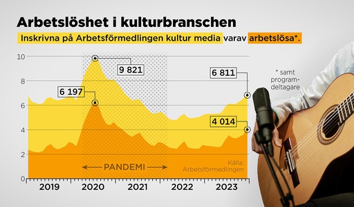 Inskrivna på Arbetsförmedlingen kultur media varav arbetslösa och programdeltagare 2019–2023.