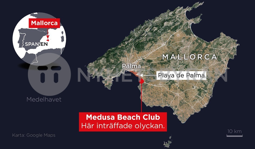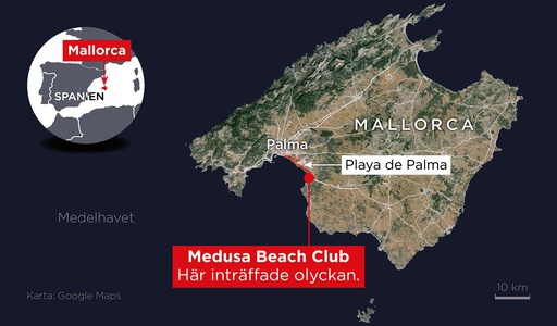 Kartan visar var den olycksdrabbade restaurangen Medusa Beach Club i Playa de Palma på. Mallorca ligger.
