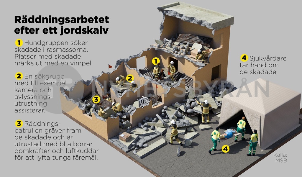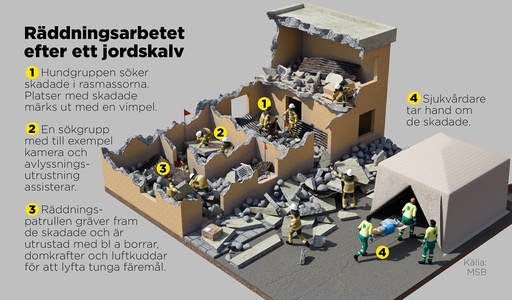 Sök- och räddningsarbetet efter ett jordskalv sker i flera steg från sökning med hund fram till dess att skadade kan tas om hand av sjukvårdare.
