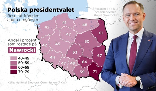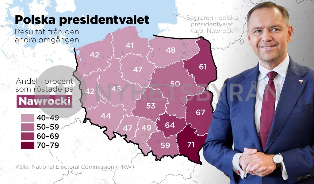 Andel av de befolkningen som röstade på Karol Nawrocki i procent. Resultat från presidentvalets andra omgång.