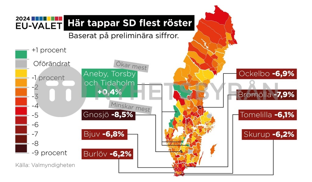Förändring i Sverigedemokraternas stöd vid EU-valet 2024 jämfört med EU-valet 2019.