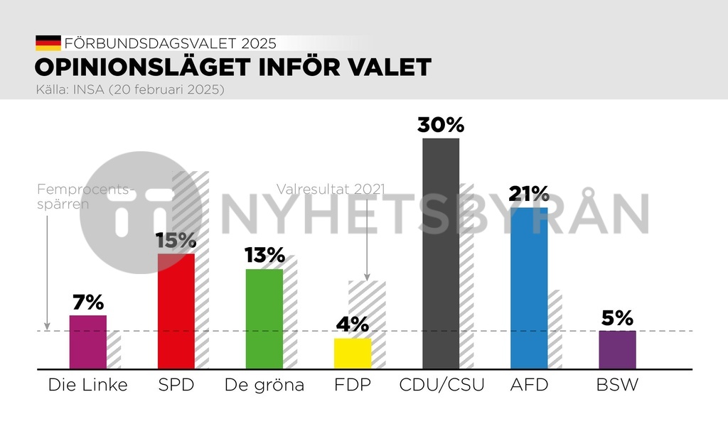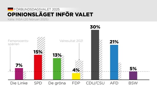 Opinionsläget i Tyskland dn 20 februari inför valet till förbundsdagen på söndagen.