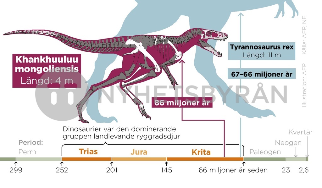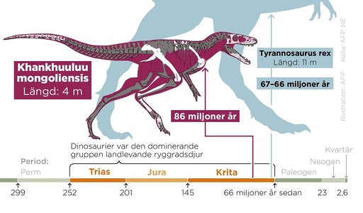 Dinosauriearten Khankhuuluu mongoliensis tros ha levt för cirka 86 miljoner år sedan och är besläktad med den betydligt större Tyrannosaurus rex.